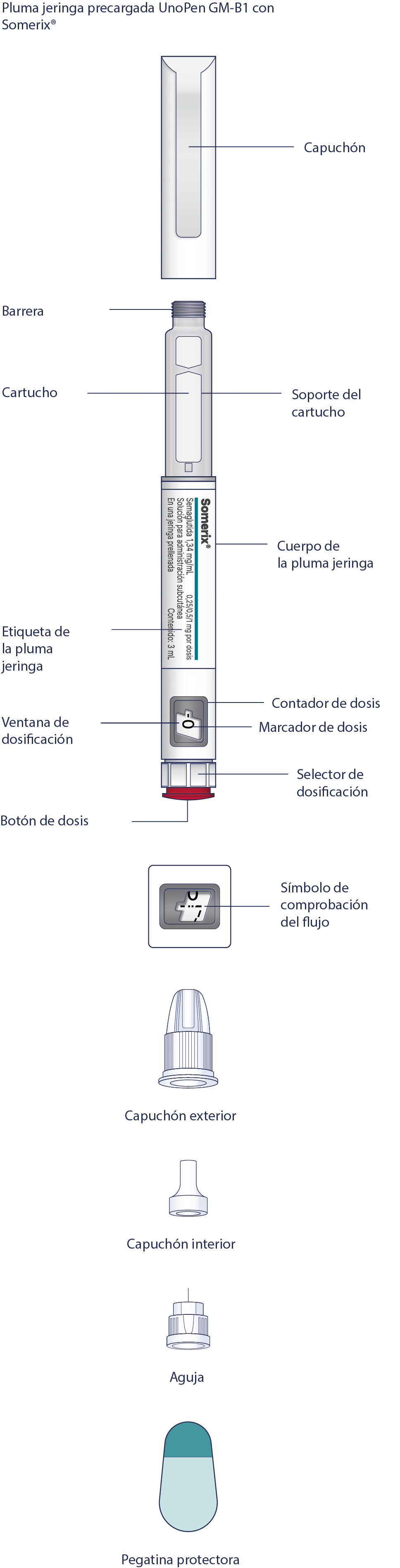 En la caja de Somerix hay 4 agujas desechables de 4 mm, es decir, una pluma con las agujas da para 4 inyecciones a una dosis terapéutica de 1 mg. Durante la titulación del medicamento o a una dosis terapéutica inferior a 1 mg, hay que adquirir agujas adicionales en una farmacia o una tienda para diabéticos.