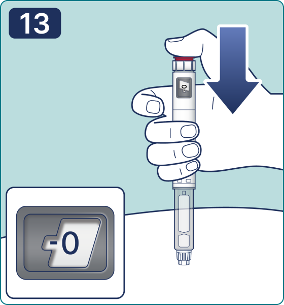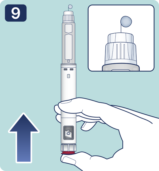 9. Sujetando la pluma jeringa apuntando la aguja hacia arriba, presione el botón de dosis y manténgalo en esta posición
