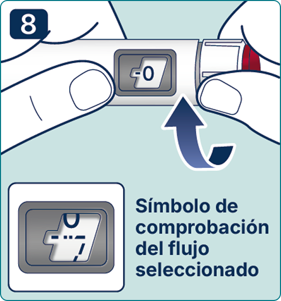 Gire el selector de dosis hasta que aparezca el símbolo «» de comprobación de flujo en el contador de dosis. Escuchará 2 (dos) clics.
